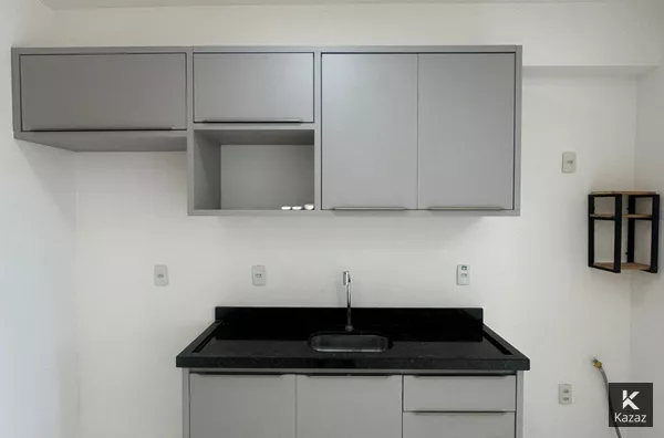 Cozinha americana com planejados e gás canalizado.