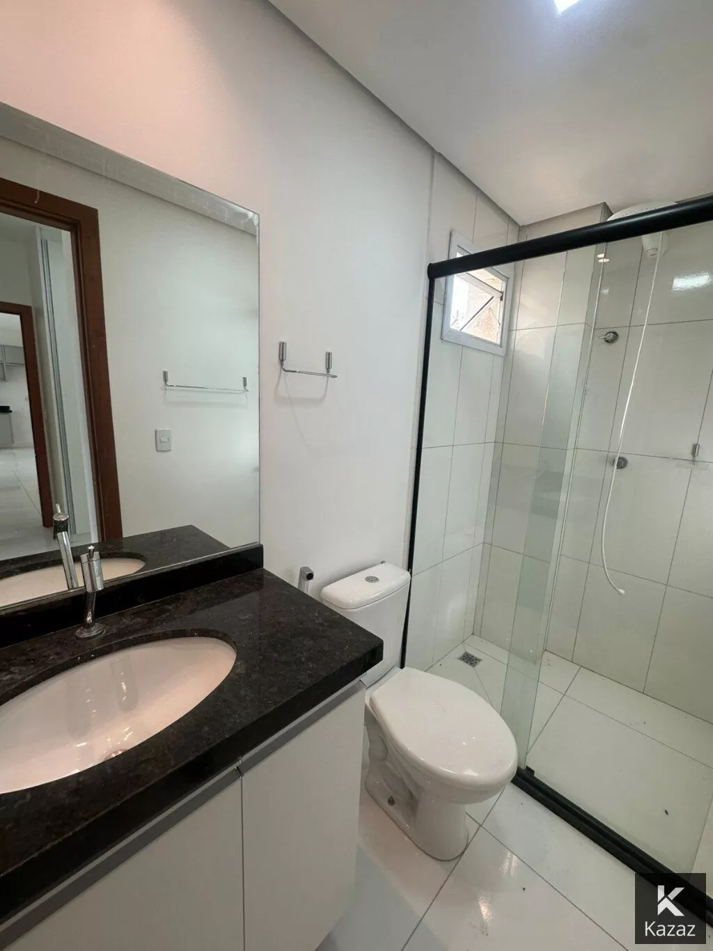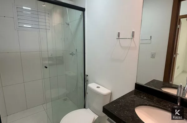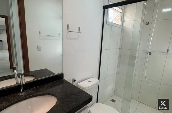 Banheiros completos com box, espelho, armários e chuveiro novo.